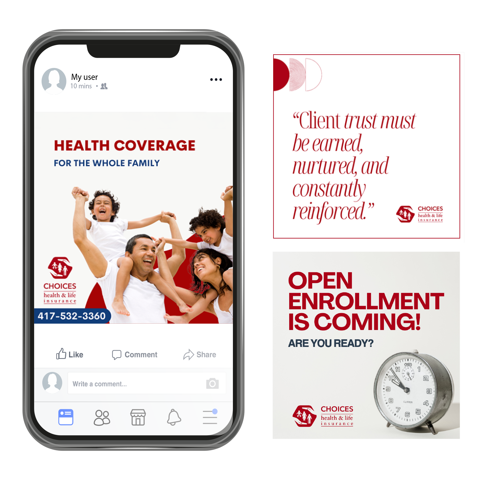 LOGO, SOCIAL MEDIA GRAPHICS, AND PRINT DESIGN A logo refresh, graphics for social media, business cards, signs, and other merchandise for a local health insurance agency.